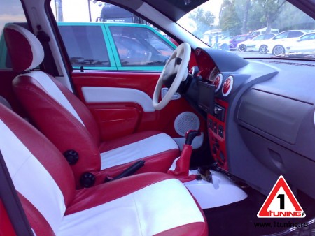 Interiorul vine in doua culori - alb si rosu, cu huse in aceleasi culori. LED-urile din partea inferioara, de la picioare, lumineaza rosu, luminile din bord au fost inlocuite tot in scopul aceleiasi combinatii cromatice, iar plafoniera are LED-uri albe. Sistemul DVD din tetiere si volanul imbracat in piele alba schimba, de asemenea, peisajul.