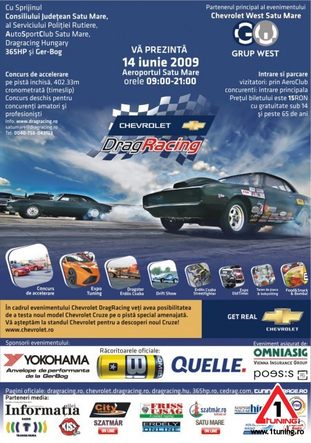 La data de 14 iunie, Aeroportul din Satu Mare va gazdui cel mai mare eveniment automobilistic din istoria judetului. Evenimentele din categoria auto din ultimii doi ani, respectiv tuning showurile de exceptie, au beneficiat de un succes deosebit. De aceea, AutoSportClub Satu Mare impreuna cu echipa DragRacing Ungaria, organizatorul Campionatului Maghiar de Accelerare, membru regional al retelei King of Europe doresc realizarea celui de-al treilea eveniment automobilistic la data de 14 iunie pe Aeroportul satmarean. Anul acesta evenimentul se intituleaza Chevrolet DragRacing, partenerul principal este Chevrolet West Satu Mare si se va desfasura sub egida Consiliului Judetean.